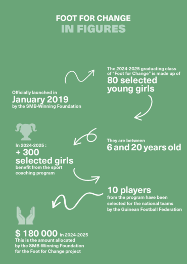Foot for Change is a project to promote athletic and academic excellence for young girls in Guinea. Officially launched in January 2019 by the SMB-Winning Foundation, the objective of the Foot for Change program is to offer young Guinean girls who are passionate about sports and aspire to succeed in their academic careers a double quality education, thus facilitating their socio-professional integration.